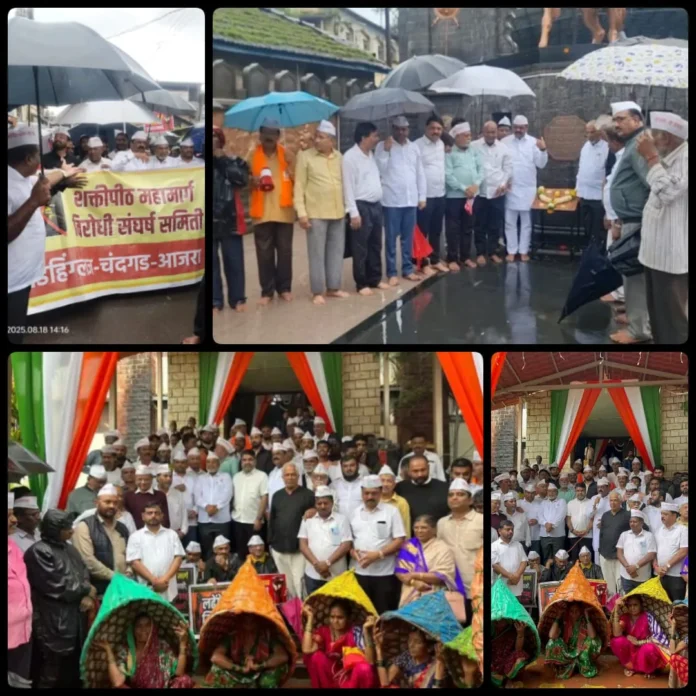 आजरा (हसन तकीलदार):-जनतेची मागणी नसताना, दळणवळणासाठी गरज नसताना राज्यातील 12जिल्ह्यातून जाणाऱ्या शक्तिपीठ महामार्गाला विरोध दर्शवण्यासाठी रयतेच्या राजासमोर शिवतीर्थावर बळीराजा एकवटला. धो धो संततधार पावसात भिजत महिला शेतकरी डोक्यावर इरलं घेऊन सहभागी झाल्या. कोणत्याही परिस्थितीत शक्तिपीठ महामार्ग होऊ न देण्याचा निर्धार यावेळी करण्यात आला. रयतेचा राजा छत्रपती शिवाजी महाराज यांच्या चरणी पुष्प अर्पण करून शिवतीर्थ ते आजरा तहसील कार्यालयापर्यंत मोर्चा काढण्यात आला. माजी खासदार राजू शेट्टी, आमदार सतेज पाटील, विजय देवणे, प्रा. सुनील शिंत्रे, विद्याधर गुरबे, कॉ. संपत देसाई, उमेश आपटे यांच्या नेतृत्वात भर पावसात भिजत मोर्चा काढण्यात आला. मागील चारपाच दिवसापासून आजऱ्यात धो पावसाने कहर केला आहे. अशा धो पावसात सुद्धा शेतकऱ्यांनी आणि सर्व विरोधीपक्षीय नेत्यांनी पावसाची तमा न बाळगता मोर्चा यशस्वी केला. एकच जिद्द -शक्तिपीठ रद्द, जमीन आमच्या हक्काची नाही कुणाच्या बापाची, या सरकारचं करायचं काय?…. अशा अनेक घोषणा देत परिसर दणाणून सोडला. यावेळी अनेक उपस्थित मान्यवरांनी आपले मनोगत व्यक्त करीत शक्तिपीठ महामार्गाला कडाडून विरोध केला.