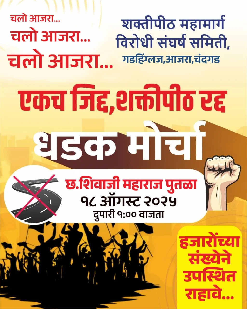 सोमवार दि. 18ऑगस्ट 2025रोजी आजरा तहसील कार्यालयावर निघणारा मोर्चा यशस्वी करण्याचा निर्धार आज शक्तीपीठ महामार्ग विरोधी संघर्ष समितीच्या बैठकीत निर्णय घेण्यात आला.हजारोच्या संख्येने उपस्थित राहून मोर्चा यशस्वी करण्याचे आवाहही यावेळी करण्यात आले. बैठकीच्या अध्यक्षस्थानी मुकुंददादा देसाई होते.