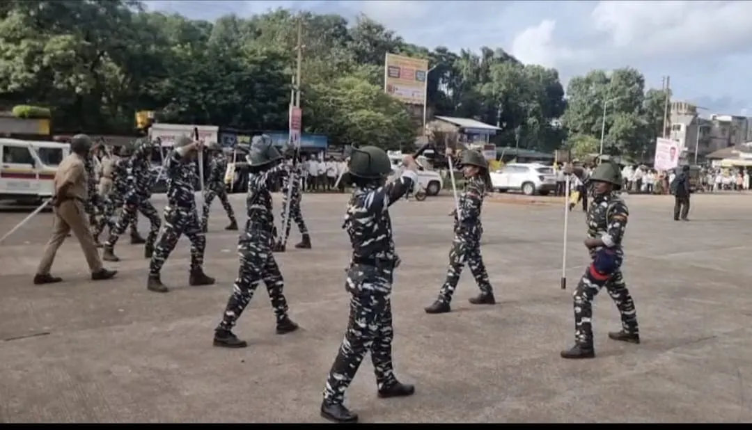 आजरा (हसन तकीलदार):-गणेश चतुर्थीच्या पार्श्वभुमिवर शहरात शांतता व सुव्यवस्था राखण्यासाठी आजरा पोलिसांकडून गणेचतुर्थीच्या आधी पोलीस पथ संचलन व दंगा काबू पथकाची प्रात्यक्षिके करण्यात आली. ज्यामध्ये पोलीस अधिकारी आणि पोलीस जवान आजऱ्याच्या मुख्य बाजारपेठ व गल्ल्यातून वाहनासहित पथसंचलन केले.