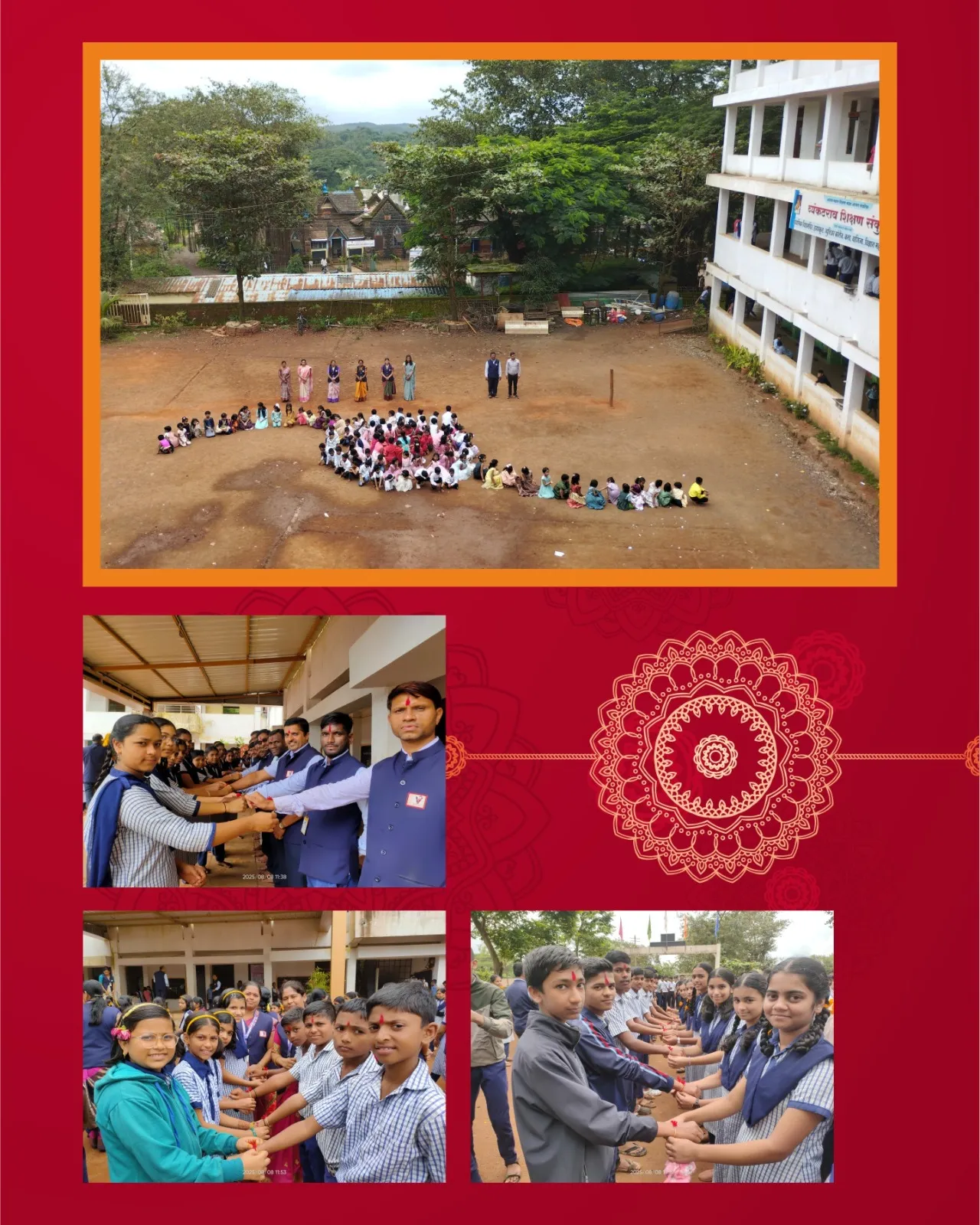 अध्यक्ष जयवंतराव शिंपी यांची या आनंदमय सोहळ्यास उपस्थिती यामुळे कार्यक्रम आणखीनच उत्साहवर्धक झाला. प्राथमिक शाळेतील सर्व विद्यार्थ्यांनी शाळेच्या मैदानावर मोठ्या रांगोळीची प्रतिकृती तयार करताना स्वतः सर्व विद्यार्थी या आकारात उभे राहून एक सुंदर मोठ्या राखीच्या कलाकृतीची निर्मिती केली.ही प्रतिकृती अगदी मनमोहक होती.